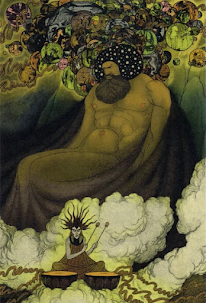 The stories are all incredibly short and literary. Dunsany's language is lyrical and poetic, filled with repeated language and pacing. It has the vibe of the Burton translation of the Tales from the Arabian Nights. Dunsany starts with a description of MANA-YOOD-SUSHAI, the ultimate creator, who creates smaller gods, then goes to sleep, lulled into slumber by Skarl, his drummer. Dunsany then moves to these small gods - Demiurges who create the world and humanity, then to the extremely localized home gods that make their abode on Earth, and from them to the priests, and to the prophets, and at last to the various kings, before circling back to speak of a very quiet Ragnarok. There is not of expository material here, and much is left hanging (is Skarl the Drummer a small god or something else entirely? Is one set of home gods different from another?), but the language is excellent - it feels good to be read aloud.