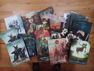 Nightfall (Angelo Paluso, Mana Project Studio, 240 page hardback) and Nightfall Bestiary (Angelo Paluso and Andrea Lucca, Mana Project Studio, 168 page hardback). This is also "grimdark" (It says so on the cover), but is written to a larger scale. Darkness from the shadow plane has risen, the sun has gone out (its deity dead/converted), though the moon still provides what light is available. The moon still works without the sun, because, well, magic. It is literally a points of light campaign, with only a few places that not overrun with monsters. Nightfall is Italian, and comes out with a beautiful look for a dark setting. The monster book eschews redoing D&D monsters for more Italian Folklore, though it does list creatures in subcategories (Dragons, Horrors, Witches). This can make for a more cohesive read, make it harder to find what you are looking for as opposed the alphabetizing the entire list. I probably will not play it, but I will read it through. Came with a boatload of Kickstarter-Tchotchkes which are generally useful in play - a DM (Sorry, Nightmaster) screen, Standups, separate map, pregens, and a cute pin.