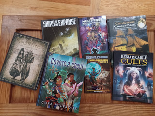 Ships of the Expanse (Keith Garret, Lem Lemke, Mari Murdock, Nicole Winchester, Writers/Designers, Green Ronin Games, 144 page Hardback). I have not played the Expanse RPG, but I really like the design of the games in this line, and the spaceships in general. It scratches that Traveller itch of my game design history. The Ronins have done a fantastic job with this production, not only on presenting the ships but also talking about hard-science intra-solar system space travel. And I want to unleash these deck plans on others, now. Picked this copy up at Olympic Cards and Comics down in Lacey, which has a LOT of non-traditional RPGs that I don't find elsewhere..