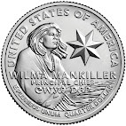 The coins are already settling into a comfortable type - figure on the left-hand side, shown torso up, symbology in the background on the right-hand side (A symbol of the Cherokee nation, all contained by a circle with all the required data. I think we are going to lose her note as Principal Chief and the Cherokee words beneath in the folds of her shawl. It is a very busy coin.