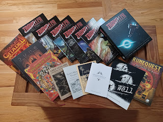 The Red Book of Magic (Jeff Richard, Greg Stafford, Steve Perrin, Sandy Peterson and more, Chaosium). Hardcover, 126 pages. Runequest is my personal tsundoko - having more books than you ever are going to read, or in this case, games you are never going to use. I find Glorantha fascinating, ever since White Bear/Red Moon, and have followed Runequest through its many incarnations (including the AH version and HeroWars), yet never played the RPG. This volume is primarily a spellbook on spirit magic, gathered from many previous sources and brought up to date, and, like all of the modern Runequest material, looks impressive.