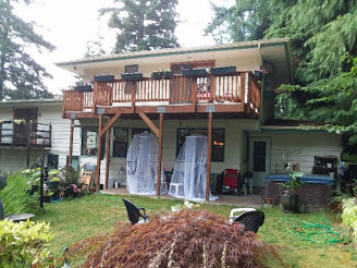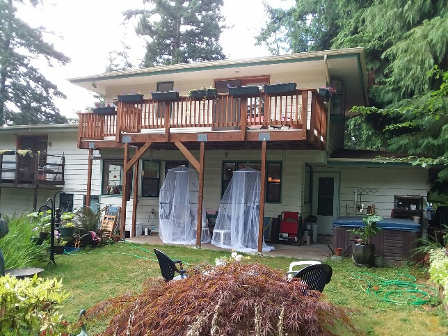 Meanwhile, the household's COVID-19 project, the new back deck, is wrapping up. The old deck off our bedroom was rotting away, and when replacing it we expanded it out by about four feet, creating both a larger upper porch and a covered patio beneath. Re-hung the temple bell. We have hanging chairs suspended from the rafters and the Lovely B has wrapped them with mosquito netting, which has made evening relaxation much easier but look like flumphs are nesting beneath the deck.