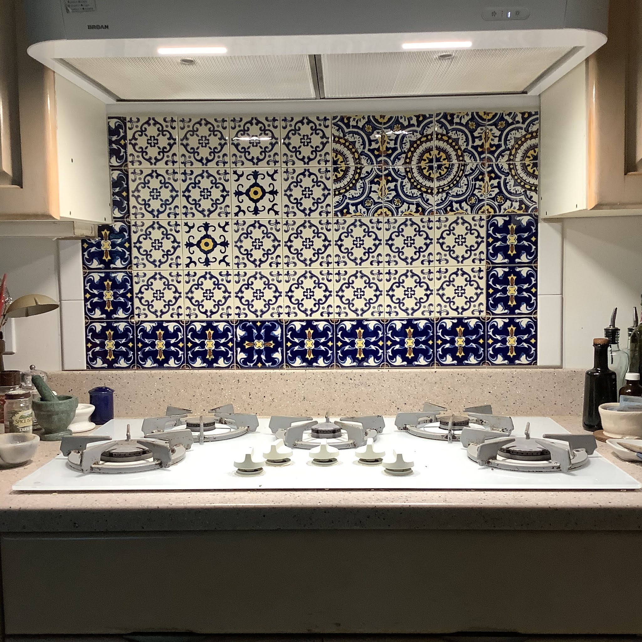 As far as Kate is concerned, HER big project has been putting tile behind the stovetop. When we lived in Lake Geneva, we re-did the bathroom in tile, and she saved the remains of the tile and shipped them out here to eventually do something with them. So she found something to do with them. She still has to grout them