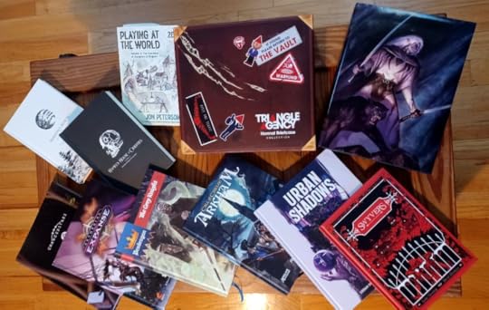 Urban Shadows by Mark Diaz Truman and Marissa Kelly, Magpie games, 320 pages, 2024, Kickstarter. This is 2nd edition of the game, the first being 10 years previous, much like the current D&D. Powered by the Apocalypse, and hews more tightly to all the options presented there than, say, Brindlewood Bay. We have moves, we have play books, we have a lot of player empowerment. Has a heavy scent of the World of Darkness in its urban fantasy with factions as different character ancestries. The interior is very, very purple, but it is an impressive volume,