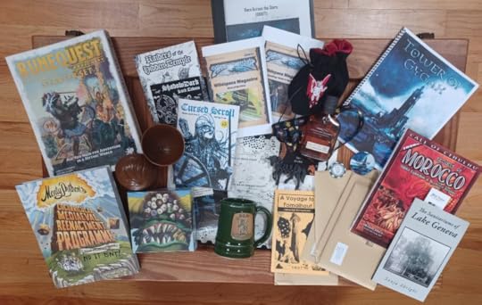 I was a guest last week back at Gary Con, a convention celebrating the life and works of D&D co-creator Gary Gygax. It was held in the Grand Geneva Resort in Lake Geneva, Wisconsin. It is one of the best-run, most-fun conventions in gaming. For me it is a chance to game, meet new gamers, and hang out with old friends from TSR. And I pick up some interesting stuff in the process. Only one of the items shown at the right is from a Kickstarter. The rest come from my experiences in beautiful Lake Geneva (hey, it didn't snow this time). Here's what is in the photo: