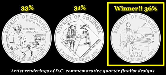Then I found this: A Frederick Douglass quarter, with a flipped image to the current version, was one of the nominees for the STATE quarter series, only to be beaten out by Duke Ellington (whom I always connected with New York City and the Harlem Renaissance). So the Freddie-D quarter was already a backup, and got the slot as a consolation prize.