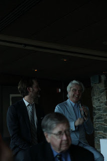 David Byrne takes questions from the floor.Dinner was a limited menu but completely up to Canlis's standards. Five tables of ten. Ours had Darragh, Braden (alas, I missed my chance to recommend that, since they were ripping out seats at the venerable B-W, they could replace them with recliners), the retired couple, a psychologist working on his dissertation, married to author who writes books on investing. And a couple, the husband of which I had little chance to talk to, but whose spouse worked for Wells Fargo and was part of the Arts Fund, and who worked for one of the OTHER Jeff Grubbs in the universe. Dinner was a perfect filet mignon for me and a flaky halibut for the LB, but out attention was on the discussion, not the food.