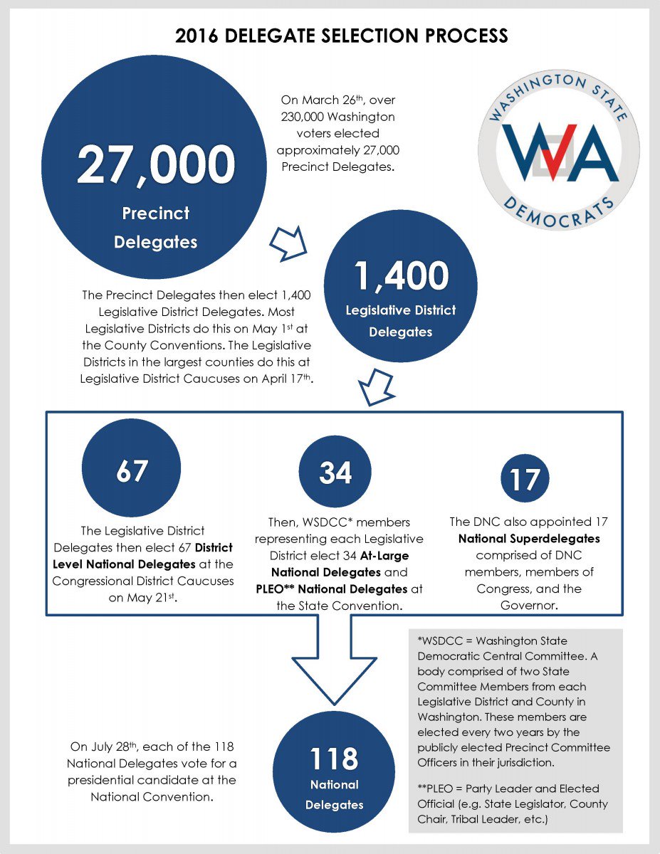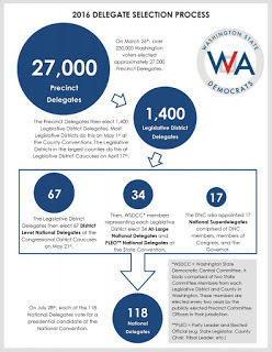 The Democrats made an infographic.At this year's Democratic caucuses, with the non-establishment candidate, Mr. Sanders, took the field, with 74% of the vote. So he'll get 74% of the 118 national delegates, right? Not quite. If everything holds, he get 74% of the 67 delegates that are chosen by this method. Another 34 delegates are chosen by the Washington State Democratic Central Committee, which in turn is made up of representatives chosen by the precincts (which again, are those who are invested in the system). Supposedly these 34 members are supposed to reflect the will of the caucus results as well. THEN there are the super-delegates, which you may have heard of.