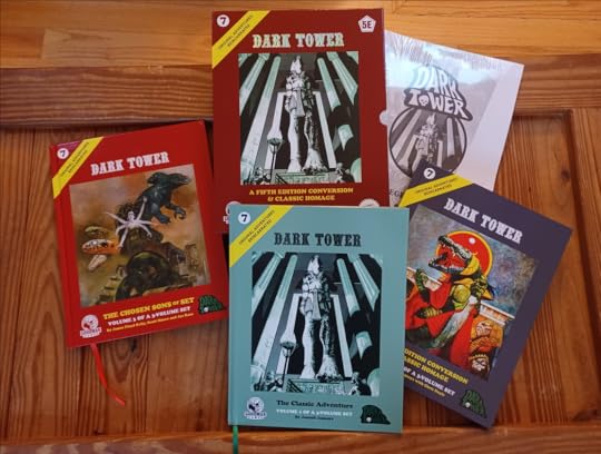 Dark Tower by Jennell Jaquays and others, Goodman Games, Goodman Games, 2024, consisting of a 96-page hardback, a 316-page hardback, a 164 page hardback, additional handouts, slipcased, Kickstarter.