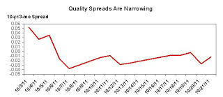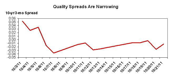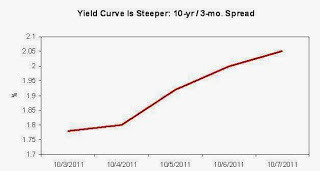 That all-important measure of investor confidence, the difference in yields between the10-yr. note and the 3-mo. bill, is improving.