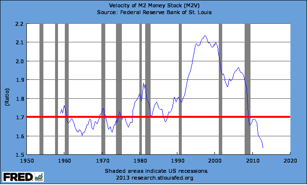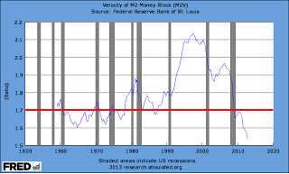The stock market may have made a new high, but this low velocity suggests that we are a long way from a recession that would cause a market decline. Chart source: http://research.stlouisfed.org/fred2/series/M2V/Buy Timing the Market at Amazon.com