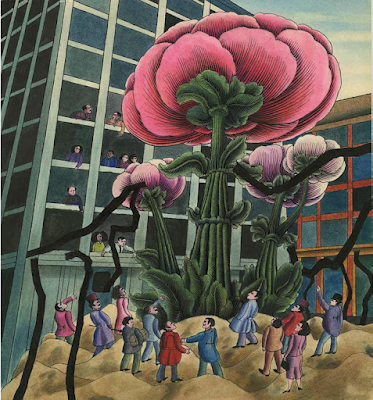 Nous avons beaucoup apprécié qu'une expo soit consacrée à un artiste qui a commencé sa carrière dans la pub, puis est passé par le dessin de presse et le livre pour enfants. Je ne connaissais pas son nom mais en découvrant ses images, je me suis trouvé dans un terrain de mémoire familier, comme si je les avais aperçues durant mon enfance. Le Foll a un dessin très précis, avec des objets et personnages "réels" qui se mêlent à des fleurs et plantes psychédéliques.