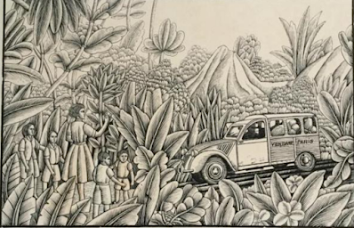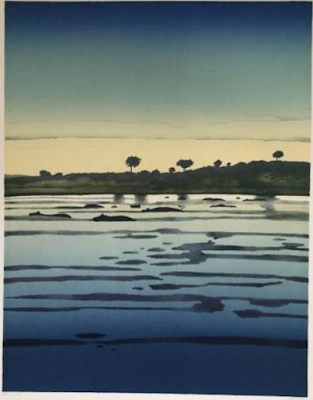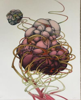 L'expo mène de manière intéressante de ce travail "commercial" à un travail personnel de dessins et de lithographies. Le Foll a fait de très beaux travaux sur les paysages, explorant les formes, les lignes et les couleurs (voir le paysage africain, ci-dessous - ses visions des rochers des îles anglo-normandes poussent dans l'abstraction). Une salle plus profonde encore nous emmène dans l'étrange (-1D3 points de SAN), avec des images qui s'intéressent au lien entre l'animal, le végétal et le minéral, avec des anatomies impossibles, des visions de tubes, de tiges et d'articulations harmonieusement arrangées.