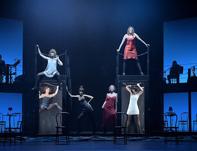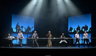Les musiciens sont présents sur scène (et très bons), les actrices et acteurs du français savent jouer, chantent fort honnêtement, dansent plutôt bien. Le programme annonce que la pièce est née d'un travail de réflexion et de partage sur leur métier d'acteurs, la joie de faire partie de cette troupe extraordinaire, les peines particulières liées à ce travail. Un numéro très touchant montre Elsa Lepoivre (que nous avions admirée dans Lucrèce Borgia) montant trois fois sur scène la même journée pour trois pièces différentes tout en attendant un message d'une personne chère dont on ne saura rien. Ce passage est de loin le plus émouvant de la soirée (et par les dieux de l'Olympe, quelle actrice ! Même quand elle joue une bribe de bribe du rôle, on l'entend, elle sonne et résonne...)