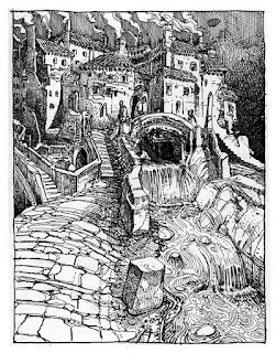J’ai ressenti le besoin impérieux d’affiner au fil des tomes(n’y voyez pas de référence alpestre), par le dessin, les codes qui étaienttransmis par l’écriture. Par exemple quand Noon plonge dans ce qui semble êtreun monde alternatif, les images basculent en négatif. L’image doit avoir une lisibilitémoins évidente, comme dans la réalité du lecteur issu de son monde physique quiest plongé dans une vision parallèle. Ou là dans le texte, un bâtiment dont onne sait pourquoi il a été dessiné, sinon qu’il s’effondrera 30 pages plus loin.Ou la narration en cases panoramiques des tribulations de Noon et Yors au-delàde la ville. Dans ce cas précis, ce n’est pas un effet de style. Il n’y a aucunmoyen d’illustrer ce passage comme j’ai illustré le reste des ouvrages. Ce sontdes suites de descriptions lapidaires de lieux, et d’actions résumées. Il nefaut laisser qu’une impression fugace de ces moments, et surtout pouvoir enréaliser plusieurs. Alors plutôt que de faire Une illustration d’unmoment, il valait mieux faire dix bandeaux, petites respirations graphiques dansles tribulations de Yors et Noon. Et le procédé fonctionne aussi (je l’espère)vers la fin du tome 3, mais à cet endroit, pour « ralentir » lalecture, d’une certaine manière. Le texte est d’une telle concision que jevoyais plus d’images qu’il n’y avait de texte dans l’aboutissement du chapitre.Et quelque part, les dessins « ralentissent » le temps de lecture enobligeant le lecteur à passer d’une ligne d’écriture à une image ; et à cemoment précis de l’ouvrage, la résolution de l’histoire est tellementimportante que j’espère contribuer à cet instant abrupt et juste de l'écriture,dans lequel on peut rester quelques secondes de plus à cause des images.