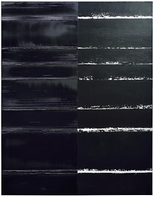 J'ai été enfin touché par la découverte de la relation entre l'oeuvre et l'espace (les toiles suspendues, disposées dans des espaces plus grand), qui rejoignent ce que j'ai compris de l'oeuvre de Richard Serra à travers le chef d'oeuvre de Juan Tallon. (super bouquin que je n'ai pas chroniqué ici, tiens, dommage). Les oeuvres ne sont pas seulement des objets, mais des objets qui s'inscrivent dans un espace où entrent le regard et le corps du visiteur, de la visiteuse. Cette relation du corps à l'oeuvre me parle beaucoup.
