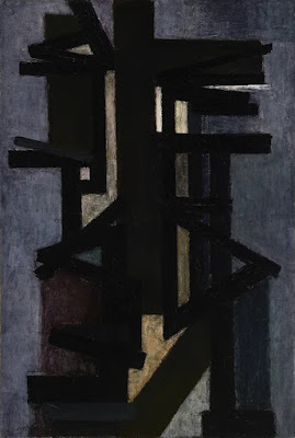 L'exposition Soulages (nommée la rencontre) au musée Fabre de Montpellier est très bien. Elle a été mon premier contact avec l'oeuvre de ce peintre. J'ai mis des repros ci-dessous, pour mémoire, mais des tas de pixels pour représenter ces peintures, celles-ci en particulier, ça ne rend rien du tout. C'est d'ailleurs peut-être la première révélation de cette visite (évidente pour moi) : ces peintures ne peuvent se comprendre que lors d'une rencontre en présence, physique, avec les objets. Cadres, aplats de noir, coups de pinceaux, reflets du lumière sur la matière...