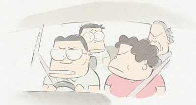 Nous avons découvert en famille ce Takahata que je n'avais jamais vu, rebuté peut-être par le dessin "griffoné", qui a aussi surpris les enfants ("mais plus tard, ce sera bien dessiné ?").Chronique humoristique d'une famille japonaise, avec le papa salaryman, la maman ménagère peu motivée, la grand-mère décidée à vivre longtemps, le fils sous pression scolaire et la fille aux yeux grand ouverts.Le récit et les gags du quotidien dérapent dans la poésie, le rêve, la peinture, les haikus. C'est doux, drôle, juste, mélancolique. Les personnages sont des gens moyens et le film nous fait aimer les gens moyens. Comme souvent chez Takahata, la forme est incroyablement libre, fragile et enchanteresse.