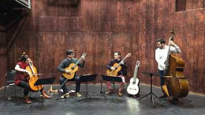 Nous avons ensuite enchaîné avec un très beau concert de l'ensemble Quatro Vozes autour des compositions d'Edgberto Gismonti, une musique sophistiquée, entre classique et jazz, construite autour de la guitare à six comme à dix cordes. Les musiciens avaient un jeu exceptionnel de précision.