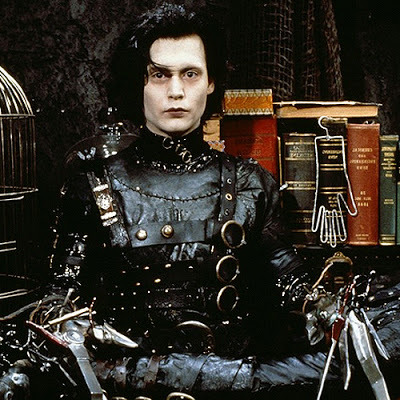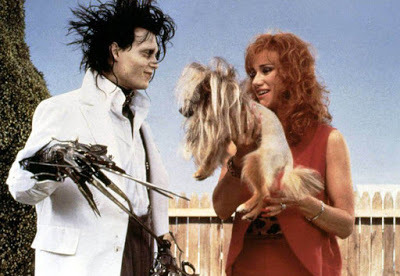 Tout le monde connaît l'histoire: une vendeuse de cosmétiques au porte-à-porte toque à la porte d'un château gothique à savant fou et ramène dans sa banlieue proprette (magnifique suburbia aux tons pastel) la créature qui y vivait.Le souvenir du film s'était estompé dans ma mémoire. Bien sûr je me souvenais des haies taillées en forme de dinosaures et du snikt, snikt, snikt qui accompagne les mouvements d'Edouard avec ses très grandes mains dont il ne sait pas quoi faire. J'ai redécouvert un film à la narration resserrée, bien monté (au ciseau), des personnages secondaires dessinés à l'acide et un univers vraiment inquiétant. On passe le film entier à craindre que quelqu'un se coupe, que quelque chose soit détruit par les longues lames d'Edouard. L'horreur sanglante est toujours sous-jacente et n'apparaît (presque) jamais ce qui donne au récit une tension étrange et dérangeante.Les scènes finales (paniques, coupures, poursuites...), après tout le temps passé dans la banlieue à la guimauve, prennent une connotation particulièrement dure, adoucie par le fin kitsch et poétique.