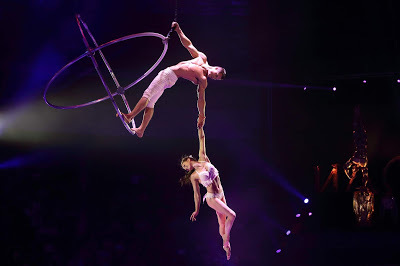 Trapèze aérien les Flying Mendoças : belle exécution technique, belles filles et beaux gars, j'ai trouvé toutefois que la machinerie déployée gâchait un peu le rythme du numéro.