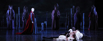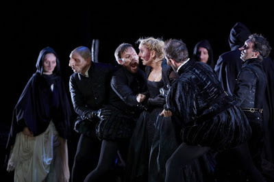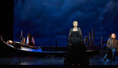 Ah ! C’est qu’une bonne action est bien plus difficile à faire qu’une mauvaise. -hélas ! Pauvre Gubetta que je suis ! à présent que vous vous imaginez de devenir miséricordieuse, qu’est-ce que je vais devenir, moi ? Cecci et moi avons beaucoup aimé, même si pour des raisons un peu différentes.Cecci a aimé les acteurs, très bien posés, intenses, dans tous les domaines. Elsa Lepoivre tenait le rôle très difficile de Lucrèce avec talent, entre pathétique, cruauté et humour. Thierry Hancisse (un de nos acteurs préférés) faisait un très beau Gubetta, méchant et drôle. Gaël Kamilindi était très beau en Gennaro, jeune premier valeureux et noble, là aussi un rôle difficile à tenir sans ridicule. Enfin, Eric Ruf jouait un Don Alphonso magnifique de rouerie et de sentiment. Les rôles secondaires, solides, tenaient tous la route. Les acteurs ajoutaient leur finesse et leurs sentiments aux rôles tranchés à la serpe écrits par le grand Vic.Cecci a aussi aimé la mise en scène, très lisible, bien rythmée (deux heures vingt sans entracte), avec de très belles images: la gondole au petit matin avec les filles et les hommes en vrac tout autour, Lucrèce avançant sur des planches d'aqua alta, le palais Borgia avec ses lettres énormes et l'horrible et malsaine danse finale de Gubetta avec les amis de Gennaro, tous empoisonnés, jusqu'à l'image finale morbide avec les corps abandonnés contre les poteaux. Waow !