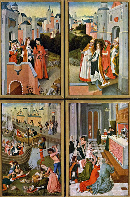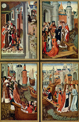 Cologne (premier livre) : on y fait la connaissance de sœurs peu éduquées qui triment dans un paysage ingrat. On a avec elle mal aux mains, aux pieds, au dos. Les sœurs triment et rêvent et voient parfois : onze mille vierges sur onze nefs merveilleuses, portées de la Bretagne, celle d'Hadrien, jusqu'au Rhin, baptisées toutes ensemble. S'animent les panneaux du retable de Sainte Ursule et ces petites figures dignes prennent vie, tremblent et se réjouissent et meurent massacrées par les Huns. Mais pour que le retable soit peint il faut que l'histoire naisse et soit composée et assemblée et soutenue par des trouvailles (des os, des pierres tombales) dans la ville de Cologne. Nous assistons à cette naissance et nous rencontrons une première visionnaire, Elisabeth, dévorée par ses visions, qui semble extraire de son propre corps, de sa douleur, la connaissance sur les mythes et l'au-delà.