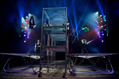 Deux numéros sont selon moi vraiment sortis du lot : celui de trampoline des frères Errani, par son énergie, sa musique, son rythme et la capacité de ces artistes de se renouveler tout le temps (ils font partie des permanents de Knie). Ce numéro de frimeurs ritals souriants et bondissants était très classique, mais réalisé avec joie et amour, et le trampoline est un agrès qui permet des effets circassiens très étranges de suspension aérienne (j'ai une hypothèse intérieure, mal formulée, qui dit que la beauté du cirque tient à des immobilités étranges dans des formes sans cesse en mouvement - comme les balles du jongleurs qui paraissent suspendues dans la lumière des spots quand le mouvement devient régulier).Le plus grand waow du spectacle, c'est la troupe Xinjiang, dans un numéro de pyramides humaines ahurissant, et surtout, dans une improbable composition graphique et physique à base de lassos, un très grand moment de cirque.