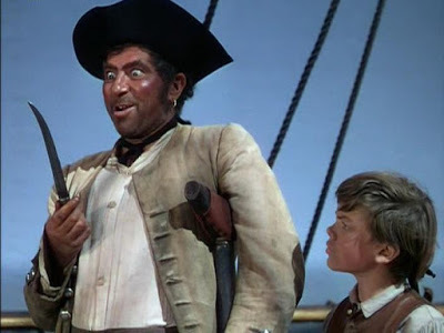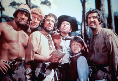 Nous avons choisi ce film pour notre séance familiale du dimanche soir : production Disney des années 50, adaptation d'une histoire que nous apprécions tous (beaucoup). Le résultat est tout à fait réussi. Le film porte la marque de son époque, de son budget (relativement) réduit, mais la narration est à la fois fidèle à celle du roman, inventive, les personnages sont bien caractérisés et le récit construit une relation très forte et intéressante entre l'enfant (Jim Hawkins) et Long John Silver, très bien interprété, avec force roulements d'yeux et gros rires, par Robert Newton. Tout comme dans le roman de Stevenson, l'histoire tourne autour de ce terrible et sympathique truand, sans doute un des meilleurs personnages de pirates jamais inventé. Sans être un chef d'oeuvre, l'île au trésor produit par Disney (la premier film sans animation produit par Walt) est une adaptation fidèle et soigneuse, avec son lot de joies, de surprises et de terreurs.