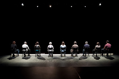 Le spectacle, maintenant.Dans une première partie, les neuf intervenants, des habitants du village, disent chacun un texte qu'ils ont écrit, face public. Les textes parlent de leur histoire, leur travail, leurs racines, ce qui les lie au lieu. Ces gens sont très beaux, qui parlent courageusement d'eux-mêmes, de leurs histoires: la championne du monde du Fandango, comment on fait une carrière de maire, les migrations des Portugais dans les années 70, la vie dans une famille avec un enfant handicapé, l'éducation pour une fille de paysans basques très pauvres, la twingo rose du grand-père...C'est beau parce que les gens sont justes, parce qu'ils font apparaître par leurs récits le monde dans lequel ils vivent.Au bout d'un moment, les récits évoquent (brièvement) l'accueil de la famille syrienne. Les acteurs prennent alors un moment pour échanger avec le public (échange tout à fait artificiel, je n'ai jamais vu ce procédé fonctionner) avant de reprendre leurs discours alternés, moins pour parler d'eux-même que pour évoquer, de manière plus théorique, l'hospitalité et l'accueil de l'autre.