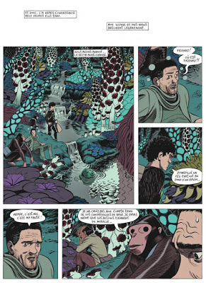 Sur une planète cyber (qui m'a évoqué celle de l'Incal) où tout le monde est implanté, Verloc ne porte rien et vit avec les avanies de son corps. Il a la quarantaine, une boutique d'antiquités, une ex-femme, une enfant autiste. Il va se retrouver embarqué, avec son frère qui a réussi, et l'étonnant garde du corps de celui-ci (un robot-singe nommé Churchill, vraiment balaise et vraiment cool) dans un voyage corporate-scientifique, à la recherche d'une substance nommée Aâma, susceptible d'avoir déclenché, sur une planète lointaine, une accélération folle de l'évolution.Il y a des trucs que Peeters réussit formidablement : la faune et la flore extraterrestre bizarre, les décors insolites et grandioses (tm), les personnages qui sonnent juste, les scènes d'actions flippantes et hallucinantes (celle qui ouvre le tome 3 est un modèle), et le fait de clôturer une série en quatre gros volumes. Et les robots singes.