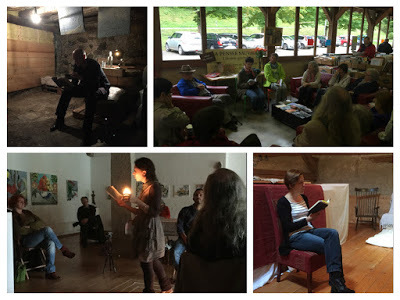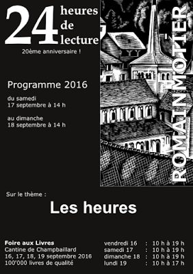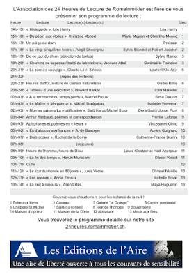 et cela pendant une heure de merveilleux rhénan, à haute voix, comme tout ce qui a suivi. Puis l'heure suivante, nous avons lu des pièces autobiographiques, bien plus locales. Puis l'heure d'après, dans une vieille grange de ferme, un extrait de manuel de jeu de rôle, des textes de slam et une nouvelle extraite de Tadjélé. Et comme ça, à chaque heure son lieu et sa lecture. Toujours dans la grange, les aventures du faux Juif Iohann Moritz, puis à a galerie d'art du village le jour du chien, puis le labyrinthe, et la science du concret selon Levi-Strauss. Après le repas, nous sommes allés dans la chapelle au-dessus de l'abbatiale écouter les naturalistes à l’affût, puis préparer une mise en scène de théâtre dans la salle du conseil de la municipalité. Il était minuit. La grande traversée des heures noires commençait, avec Proust, Boulgakov puis Michel Butor et Sato Haruo, entendu à l'intérieur de la vieille tour de l'horloge. Dans la boulangerie, on a lu Rimbaud et les aphorismes de Vinceannet Girod. Dans la salle des chevaliers du prieuré, un essai sur l'histoire de la douleur et un conte théâtral sur la folie du pouvoir. Le soleil se levait, et on n'en avait pas fini. Accompagnés de la musique du Setar, nous avons lu le sommaire de la règle de Saint-Benoît, des quatrains mystiques de Djalâl ad-Dîn Rûmî, et des extraits de l'apocalypse de Saint-Jean, installés autour d'une grande table de la maison de la dîme. Il n'y avait plus que deux auditeurs encore debout à neuf heures pour écouter Murakami, gloire leur soit rendue ! Heureusement, des renforts sont arrivés pour entendre Jules Vernes, Annie Ernaux puis Zoé Valdès sous les toits du miroir aux fées.