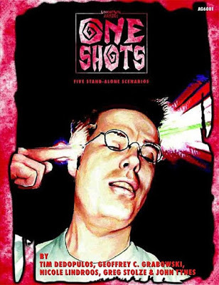 2 - qu'il existe un étonnant recueil de scénario, appelé One shots, qui contient (ô surprise !) des scénarios à jouer en une fois, indépendants et tous plus ou moins fumés, plutôt plus que moins, disons.