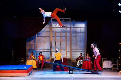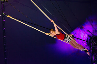 Ce spectacle ne m'a pas entièrement convaincu : les numéros de clown peinaient à décoller (même si je trouvais que les deux artistes avaient du charme), le spectacle était un peu lent et avec un léger goût de trop peu (trois des numéros annoncés dans le programme n'étaient pas présents, le cerveau aérien, la roue cyr et le hula-hop figurant dans la bande-annonce). Mais au-delà de ces réserves, nous avons pu assister à un paquet de numéros épatants. L'ouverture à la bascule, très bien mise en scène et très réussie, un numéro de mât chinois double avec quatre Tanzaniens extraordinaires de charme et de force (troupe Hakuna Matata), un très beau numéro de corde volante avec Emmaline Piatt qui fait de la balançoire juste sous le sommet du chapiteau, un sourire constamment sur le visage.