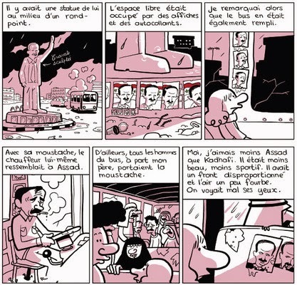 Dans l'Arabe du futur le récit à hauteur d'enfant nous fait découvrir sans aucun recul la Libye égalitariste de Kadhafi où toutes les maisons sont gratuites (et dépourvues de verrou) et le ravitaillement aléatoire, les décisions politiques instables ou bien la Syrie d'Assad, avec ses véhicules défoncés et ses maisons jamais terminées.