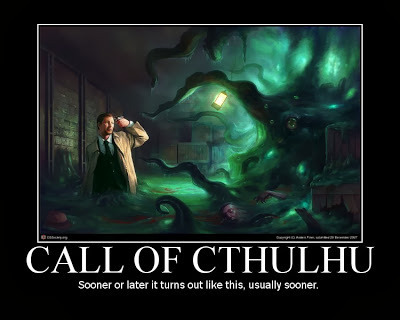 Comme j'ai dit, pas de pulp, nous avons tout joué au premier degré. Sectes, manipulations, complots, erreurs, problèmes d'argent, pas mal d'émotions et des PJs secoués par le sang versé. Un récit lovecraftien sur deux axes : l'infiltration de l'horreur (venue de l'immigration, au passage) et les rêves étranges qui envahissent la vie.
