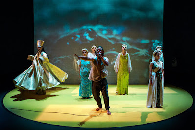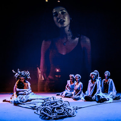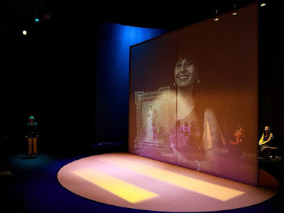 Le spectacle est très intense et très beau et parvient à assembler avec élégance toutes les idées que j'ai évoquées ci-dessus. On avait vu l'an dernier la pièce "iranienne" précédente de la même compagnie, The Glass Room, dont j'avais déjà apprécié le mélange entre théâtre, témoignages et documentaire autour de la révolution islamique. Les Perses se veut moins documentaire et plus poétique. On y voit des extraits de témoignages face caméra (très bien filmés !) sur un écran géant de femmes iraniennes arrivées en Suisse entre les années 1970 et les années 2020. Un narrateur lit leur témoignages tout en donnant l'impression d'échanger avec les images à l'écran (pourquoi les faire lire par un homme au pupitre ? Est-ce une question de rythme ?). Puis l'écran de projection devient écran de théâtre : par un jeu de lumières, il découpe la scène en deux parties, laisse apparaître un beau trio de musiciens à l'arrière-scène, donne à voir les acteurs qui passent d'un côté ou de l'autre, dans un dispositif scénographique à la fois très simple, précis et élégant. Les témoignages des Persanes rythment le déroulé de la pièce d'Eschyle, dont la troupe fait une pièce musicale accompagnée de monologues plutôt que l'inverse.