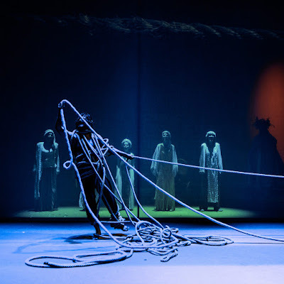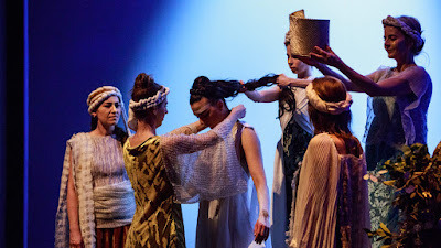 Le chœur du théâtre antique est bien présent sur scène, sous la forme de cinq femmes chantant en grec ancien, et cette partie est superbe. J'ai été transporté par les rythmes, par la musique (percussions, violoncelle et harpe), par le son étrange de cette langue dont je saisissais à la volée quelques mots. Le récit de la bataille de la Salamine par le messager terrifié est un grand moment de théâtre, à la fois épique et terrifiant, et j'ai eu le sentiment, par l'écho de la voix d'Eschyle - qui en a sans doute été témoin - d'être transporté là-bas.