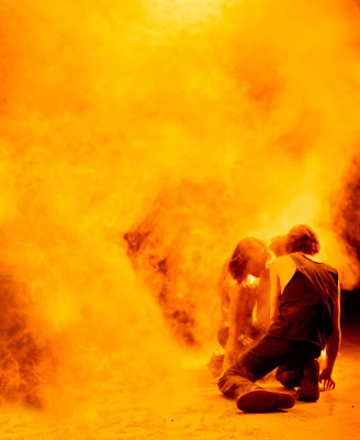 Il ne se passe narrativement pas grand-chose de plus dans ce spectacle, parce qu'il s'agit de l'explosion de la mémoire, d'un instant, à travers des ombres, des fumées, des lasers, des sons, des mouvements aux rythmes bizarres. Musique au synthé planante et énorme de Caterina Barbieri, atmosphère découpée comme avec des lames, mouvements étranges et ralentis, duplications, phrases en boucle, instant qui passe et n'en finit pas...