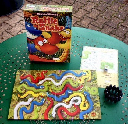 Rattlesnake Les deux jeux précédents étaient des jeux aux stratégies un peu subtiles. Rattlesnake, lui, est un "petit jeu" aux règles toutes bêtes mais très drôle : les joueurs (2, 3 ou 4) ont en main des "oeufs" de serpent en métal. Le plateau représente des serpents de couleurs différentes, emmêlés. Chaque joueur à son tour jette un dé aux faces colorées : il doit poser un "oeuf" sur un serpent de la couleur tirée. Jusque là, simple, non ? Sauf que... les "oeufs" sont des aimants très puissants, qui bougent et se collent l'un à l'autre au moindre geste maladroit, voire au moindre souffle. Et si deux oeufs s'agglutinent pendant votre tour de jeu, vous les ramassez et les reprenez en main. Et c'est parti pour des gestes infiniment lents, à regarder trembler les oeufs déjà posés comme vous tentez de poser votre quatrième oeuf sur ce damné serpent rouge...Ce qu'en dit Bruno Faidutti
