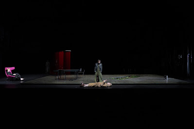 Pour le reste et contrairement au jardin des délices, le spectacle n'était pas seulement ennuyeux mais aussi très embarrassant. Il commence par cinq minutes de vidéo sans intérêt. Puis une séquence somnambulique avec la lumière qui clignote et fait mal aux yeux. Les acteurs déclament le texte d'une manière antinaturelle (je ne veux pas leur jeter la pierre, quelqu'un leur a sans doute demandé de jouer ainsi). Les costumes sont laids, un décor est laid, l'ensemble paraissait vouloir tout faire pour nous détacher du fait de croire à ce qui était représenté. Je peux comprendre ce genre de démarche artistique mais qu'on ne me demande pas de l'aimer.