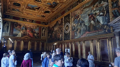 Doges Palace (Palazzo Ducale) - the residence and the seat of Venetian government, symbol of Venice and a masterpiece of Gothic architecture, has incredible interiors including intricately gilded and painting-covered ceilings, but we did something extra special. We took the Secret Itinerary tour, a small guided tour of palace rooms "where the delicate work of some of the most important bodies in the Venetian administration was carried out." Climbing up one steep darkened staircase after another, we saw the palace's jail cells, including the one where Casanova was held prisoner and from which he later escaped. We visited the complex's torture chamber and the Chamber of the Council of Ten, seat of the administrative body that worked with the Doge and his counselors to rule the Venetian state. By taking this tour, we also had the chance to walk inside the famous Bridge of Sighs!