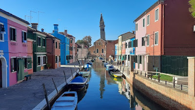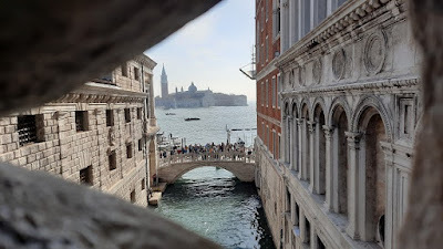 The view from inside the Bridge of SighsBurano– we rode the vaporetto past Murano, the island famous for Venetian glass production (much of which has shut down following the pandemic and the rise in natural gas prices) and arrived on the island of Burano. We strolled along its canals, fascinated by the colorful houses along their banks and amused by the island's leaning bell tower. We sat down for espresso and essi (Burano's traditional s-shaped biscuits) and admired the view. For lunch, we had pasta in a restaurant alongside a canal. Overall, a wonderful relaxful morning – highly recommended!