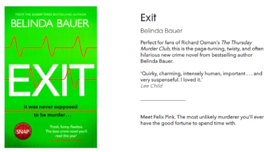 This is the background of the warm and witty Exit by Belinda Bauer(Bantam Press, January 2021), a brilliantly plotted and totally unique crime novel.