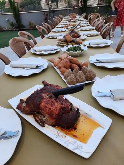 The food, prepared by Amira, her mother and her sister, was served on the long table set in Amira's yard. Roasted chicken, legs of lamb, stuffed peppers and zucchini, tabbouleh salad, stuffed grape leaves, and a variety of kubbeh. Delicious and plentiful, more than we could eat!