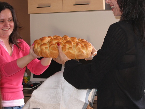 At this point, the mother is led to a chair while holding Nikola. Two women lift the pogacha over the mother’s head and a clean cloth is held to catch the crumbs. Again, the parents of these women must be alive for them to be part of this ceremony. The bread is then broken over the mother’s head and pieces are distributed to the guests. Each guest offers a blessing to the baby upon receiving their share of the bread.