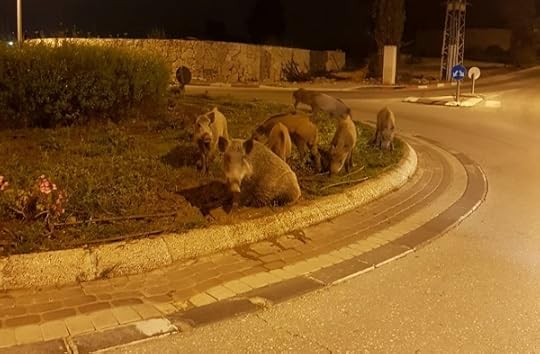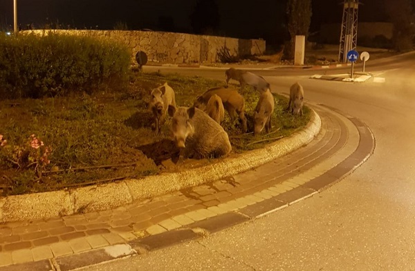 I had heard that a family of wild boars had made its home in the wilderness near my home on Moshav Neve Ilan. A shadow-filled photo depicted a late-night gathering of adults and piglets stomping around a traffic circle, sniffing at the earth. There were traces of them in my own garden – clumps of upturned dirt and hoofprints. But, for some strange reason, I never believed that they were real.