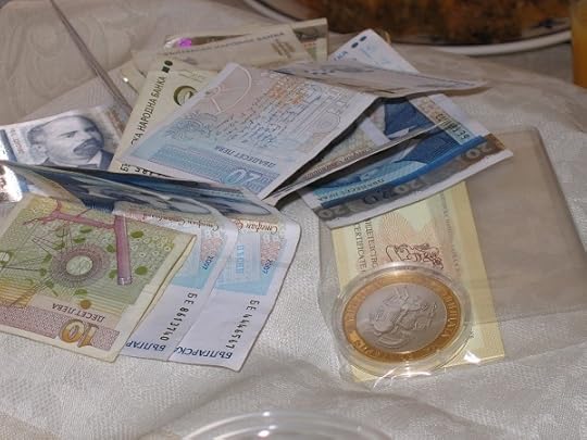 In the main room of her colleague’s home, my wife witnesses first-hand the role of the pogacha in the celebration. The pogacha was baked by a woman relative or friend – the only condition being that both her parents are alive. After drinking wine or whiskey, and wishing each other “Nazdrave” – to health – the pogacha is covered with a cloth. The women then place money, bills or coins, onto the cloth, and the corners of the cloth are gathered and tied in a tight knot. This is to ensure that the baby will not grow up to be a spendthrift. The knotted cloth is then placed out of reach on the top of a cabinet.