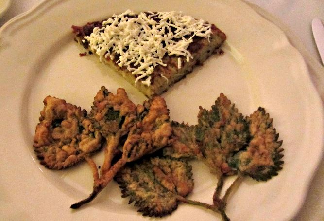 In the evenings we eat fresh beet salad and green salads including shopska, which is basically a Greek salad covered with a sprinkling of a white, salty cheese similar to feta. Potatoes are the main starch of the Rhodopes. Patatnik arrives at our table; I describe these tasty fried patties as latkes on steroids. One specialty dish which we can't identify turns out to be lightly fried nettles – delicious.