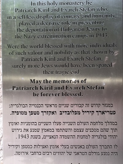 "In this holy monastery lie Patriarch Kiril and Exarch Stefan who in a selfless display of courage and humanity played a decisive role in preventing the deportation of Bulgaria Jewry to the Nazi extermination camps in 1943."